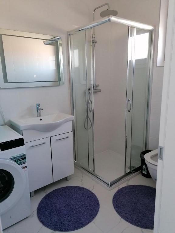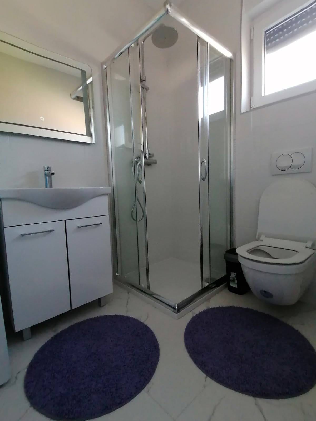 Súkromná kúpeľňa so sprchovacím kútom, wc, práčka a sušič vlasov