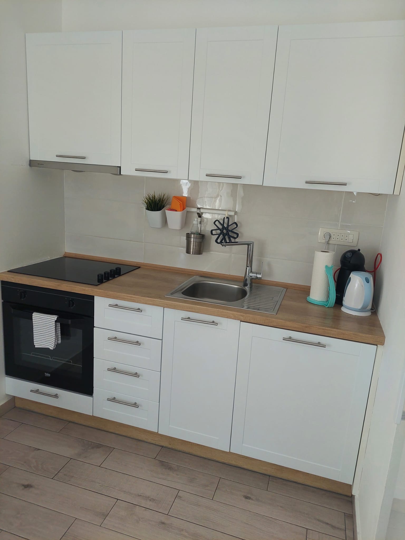kuchyňa: chladnička, rúra, sporák, mikrovlnná rúra, umývačka riadu, práčka, kávovar, rýchlovarná kanvica, kuchynský riad